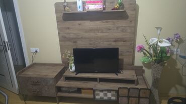 - Ölçü təxmini: TV stolu hissəsi orta ölçülü TV-lər üçün uyğundur; arxa panel stolu vizual olaraq tamamlayır