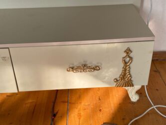 - Aşağı hissədə 2 geniş çekmece: qızılı naxışlı tutacaqlar, dekorativ aplikasiyalar