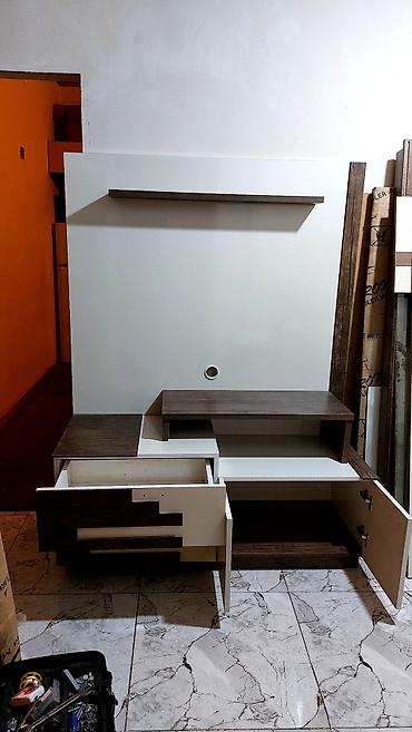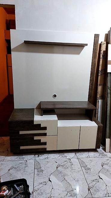 - Komplekt: iri divar paneli, yuxarıda asma rəf, ortada TV üçün platforma, aşağıda bölmələr.
