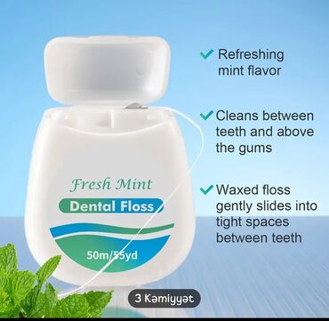 Digər cihaz növüDörd ədəd təzə nanəli diş ipi. Hər bir qablaşmada 50 metr (55 yard) diş ipi var. Dişlərinizi təmizləmək və ağız gigiyenasına riayət etmək üçün əlverişli vasitədir.1 əd 4 azn ,4 ededi 12azn