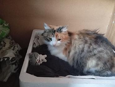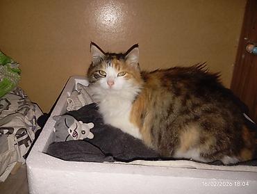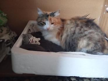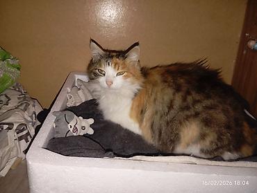 Calico (üçrəng) pişik - Rəng: ağ, qara və narıncı yamaqlı kürk; üzündə qara-ağ kontrast; burun çəhrayı - Gözlər: yaşıl tonlarda - Xüsusiyyətlər: mehriban, sığallamağı sevir, qucağa gəlir; sakit və...