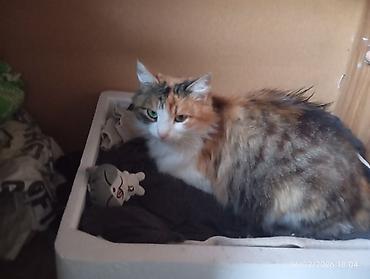 Üçrəngli (calico) uzun tüklü pişik.