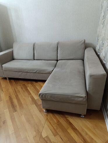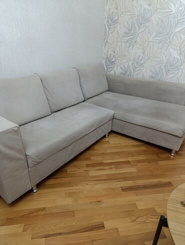 Künc divanı – açılıb‑yığılma mexanizmli, bej rəngdə - Forma: L‑şəkilli künc divan - Rəng/material: açıq bej rəngli yumşaq parça, aşağı hissələr və yanlar dəriyəoxşar materialla tamamlanıb - Oturac...