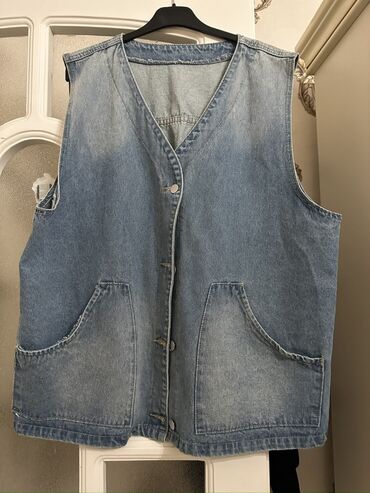 Denim jilet - Material: klassik mavi cins parça - Ölçü etiketi: XL - Dizayn: düyməli ön hissə, geniş yaxalıq - Bəzəklər: sinə hissəsində metal sancaqlar və kiçik pərçim detallar; ön panellərdə və ...