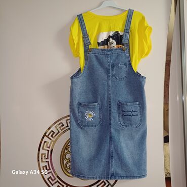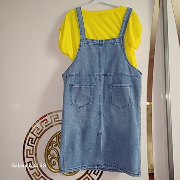- Model: mavi denim sarafan, tənzimlənən askılarla