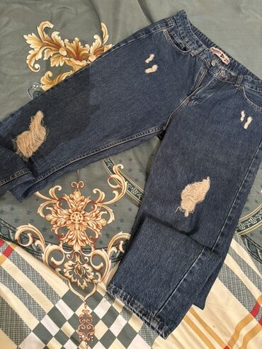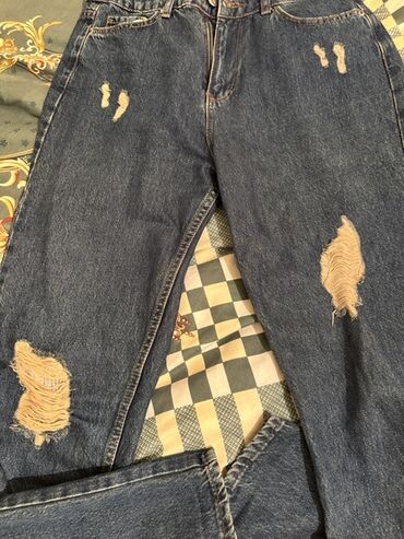 - Dizayn: hər iki ayaqda iri “ripped/distressed” effektli paçalar, üst hissədə kiçik cırıq detallar