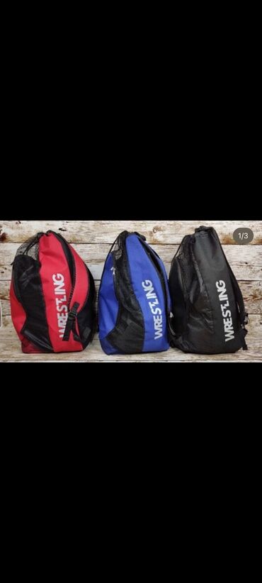 - Aksesuar seçimi: “WRESTLING” yazılı mesh panelli idman çantaları (qırmızı, mavi, qara) — nəfəsalan yan panellər, fermuarlı bölmə, çiyin üçün tənzimlənən qayış.