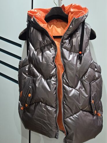 Qadınlar üçün şişmə qolsuz jilet. Turkan magazasından baha qiymətə alınıb, razmer M - Rəng: qara (xarici), qehveyi/qızılı (daxili) - Kapüşon: təbii kürklü, çıxarıla bilən kapüşon bağlama ipləri i...