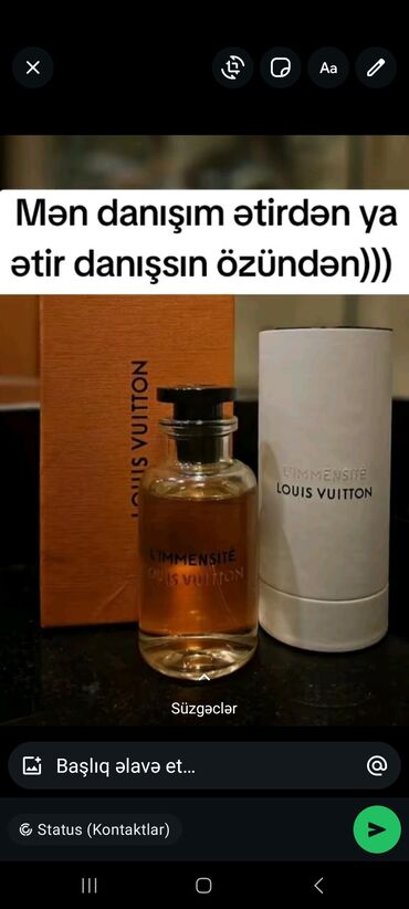 - Louis Vuitton L’Immensité – təravətli-sitrus açılışı (berqamont, qreypfrut nüansları), ardınca zəncəfil, ədviyyə və təmiz ambroks akkordu. Yüngül, zərif və müasir imza qoxusu.