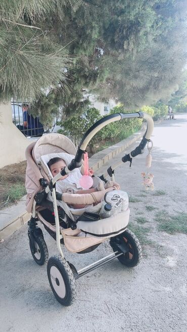 ParçaUşaq arabası – çoxfunksiyalı, üçtəkər dizaynlı, böyük hava şinləri ilə rahat sürüş təmin edir. Rəng: pudra/şampan tonları, ağ-qara tutacaq.