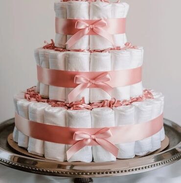 Üçmərtəbəli “diaper cake” – qız körpə üçün hədiyyə kompozisiyası. Xüsusiyyətlər: - 3 qatlı quruluş: hər qatda rulon şəklində bükülmüş uşaq bezləri. - Üst hissədə şirin fil oyuncağı (yumşaq plyuş),...