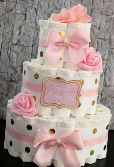 Üçmərtəbəli “diaper cake” – qız körpə üçün hədiyyə kompozisiyası