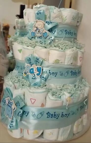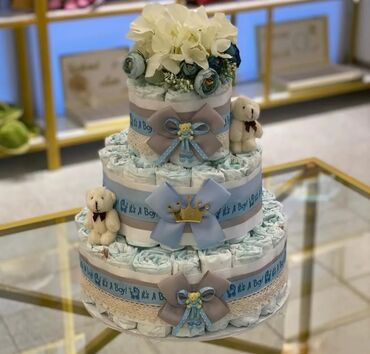 Məhsul: Uşaq bezlərindən hazırlanmış hədiyyə “diaper cake” kompozisiyası Təsvir: - 3 mərtəbəli dizayn: Hər mərtəbə sıx şəkildə bükülmüş uşaq bezləri ilə formalaşdırılıb. - Rəng palitrası: Mavi-ağ ...