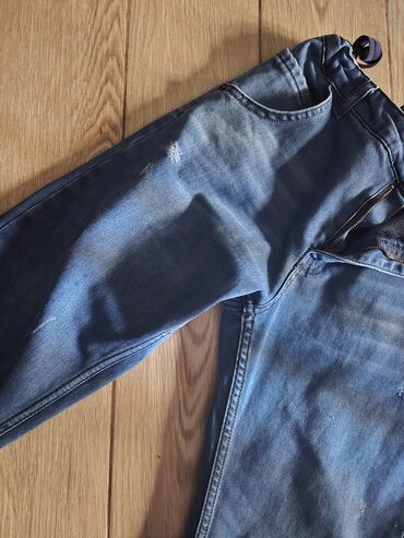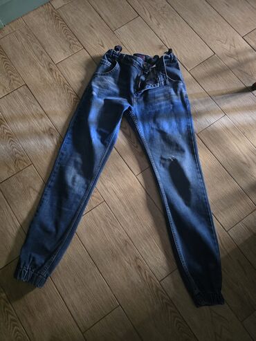 - Açıq mavi rəngdə uşaq cinsi şalvar: elastik beli, düyməli ön bağlanma, ön-arıx ciblər, arxada iki cib, bir cibdə dekorativ kəsik detalı. Ön sağ balaqda qara yazı printi.