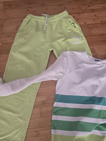 - İdman dəsti: açıq yaşıl (limon) rəngli şalvar – elastik bel və iplə tənzimləmə, yan ciblər, manjetli balaqlar; uzunqol svitşot – ağ rəngdə, sinədə yaşıl və mavi çalarlı zolaq printləri və Puma loqotipi üslubunda naxış.
