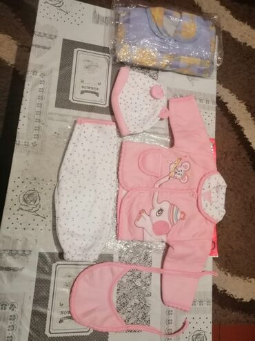 – Yenidoğan üçün çəhrayı 5 hissəli set: yumşaq parçadan düyməli ceket (fil aplikasiyalı), uzunboğaz tuman, ağ xırda naxışlı köynək, papaq və önlük. Parçalar körpə dərisinə uyğun yumşaq materialdandır.