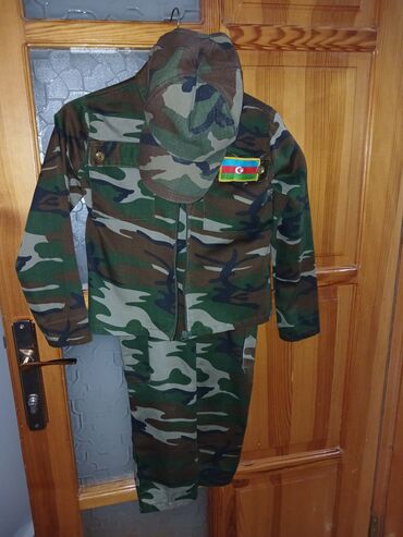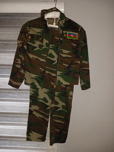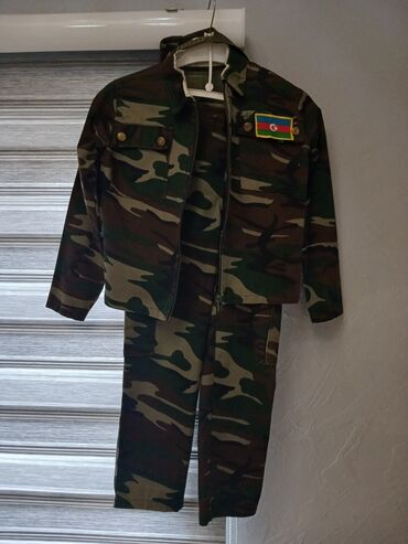 Uşaq hərbi temalı geyim dəsti - Dəst: kamuflyaj şalvar, kamuflyaj köynək/jaket, eyni naxışlı papaq və içlik kimi ağ çaplı futbolka - Rəng və naxış: klassik yaşıl-qəhvəyi kamuflyaj - Detallar: sinə...