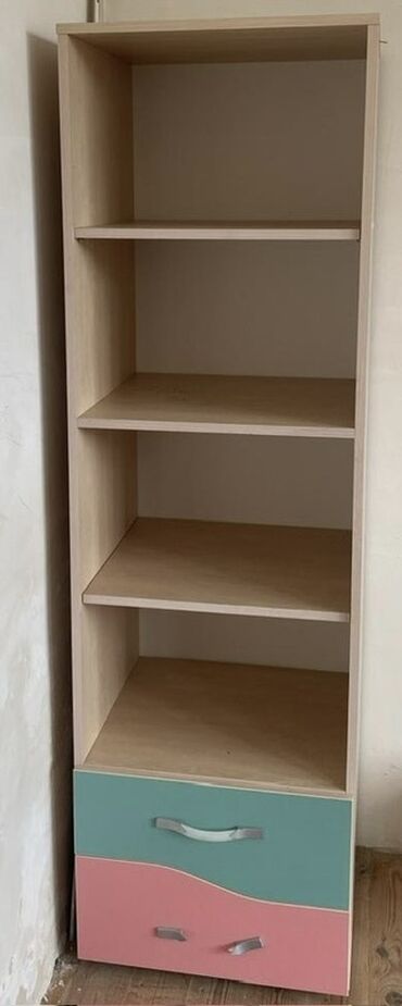 - Kitab rəfi: 4 açıq bölmə, aşağı hissədə 2 çekmece. Çəkmecələr yaşıl-çəhrayı önlüklə, metal tutacaqlıdır.