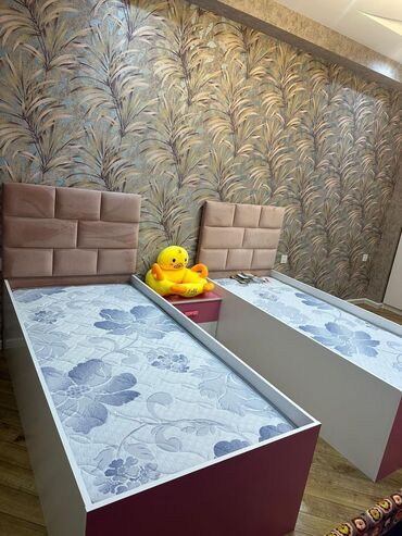 - 2 ədəd tək çarpayı: ağ və çəhrayı rəngli karkas, yumşaq bej rəng başlıqlar, hər iki çarpayı arasında kiçik tumbalı aralıq modul.