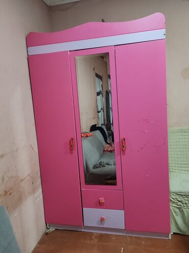 - Geyim şkafı: Üç qapılı konstruksiya, ortada tam bədən güzgüsü. Aşağı hissədə iki çekmece, yanlarda asılqan və rəf üçün bölmələr. Dalğalı üst tac detalı ilə çəhrayı-ağ rəng palitrası, dekorativ rəngli tutacaqlar.