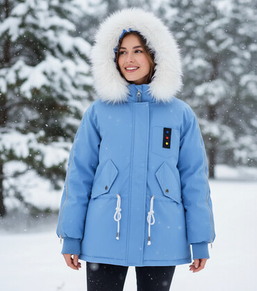 UniseksUşaq qış kurtkasi– mavi rəngdə, kapüşonlu və süni xəzli kənarla