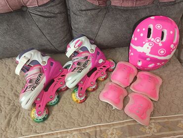- Qoruyucu dəst: çəhrayı dəbilqə (ventilyasiya dəlikli), 2 ədəd dirsəklik, 2 ədəd dizlik, 2 ədəd biləklik.