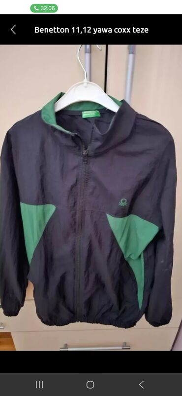 - Benetton yüngül küləkkeşi: qara-yaşıl kombinasiya, ön tam fermuarlı, qolu və beli rezinli, yan hissələrdə kontrast panellər, sinədə Benetton loqosu. Gündəlik və idman üslubu üçün uyğundur.