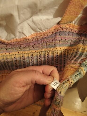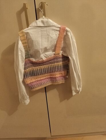 Uşaq üçün trikotaj jilet - Rəng: açıq çəhrayı əsas, üzərində narıncı, ağ və zeytun-yaşıl motivli fiqurlar - Naxış: bal pətəyi əsaslı fonda çiçək/romb fakturalı desən - Model: qolsuz, dairəvi yaxal...