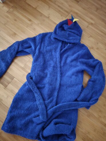 - Xalat: Qalın və yumşaq teksturalı, mavi rəngdə, kapüşonludur. Yanlarda ciblər və eyni materialdan kəmər var. Kapüşonda rəngli dekorativ elementlər.