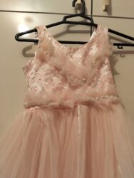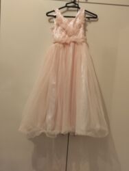 Uşaq üçün ziyafət/libas paltarı – Roseya brendi - Rəng: açıq pudra/çəhrayı - Model: çoxqatlı tül ətək, önü qısa-arxası uzun (hi-low) kəsim - Üst hissə: tül volan detallı - Bel xətti: incə daş/kris...