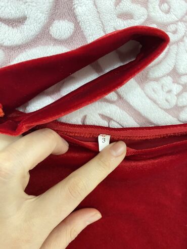 - Üst: tək çiyin kəsimli, uzunqol, məxmər/velur parça, tünd qırmızı rəng. Boyun hissəsində eyni parçadan bağ/qaş qayış detalı. Etiketdə ölçü: 3.