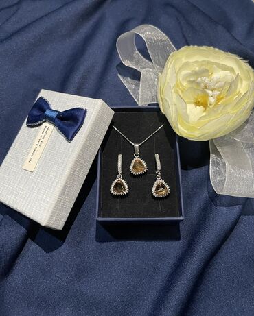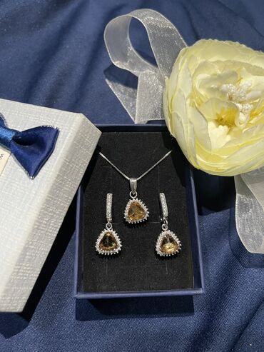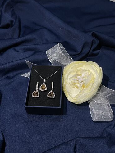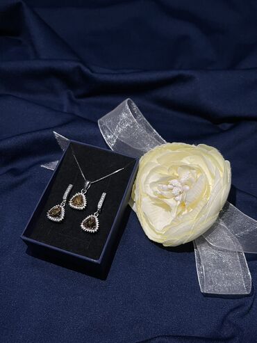 Qızıl zinət əşyaları dəsti - Üzük və sırğa komplekti: 585 prob, üzük 4 qram, sırğalar 6 qram. Üzük və sırğaların üzərində parlaq daşlardan çiçəkvari kompozisiya. - Boyunbağı: 750 prob, 6 qram. Z...