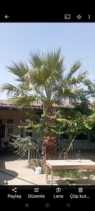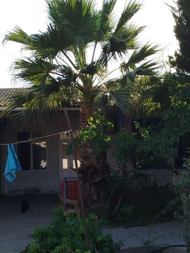 Həyətdə əkilmiş iri dekorativ palma ağacı - Növ: fan formalı yarpaqları olan dekorativ palma (Washingtonia tipli) - Təxmini hündürlük: 7–9 metr - Gövdə: qalın, lifli, aşağı hissədə quru yarpaq qal...