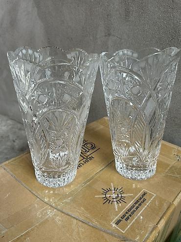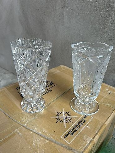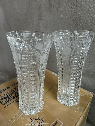 Məhsul: Şüşə/kristal vazalar dəsti Təsvir: - İki fərqli dizaynda şəffaf şüşə (kristal üslubunda) vazalar. - Soldakı vaza geniş ağızlı, ağır altlıqlı, dərin oyma naxışlarla (ulduz, romb və şüa moti...