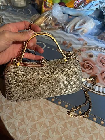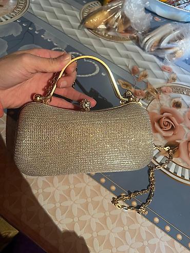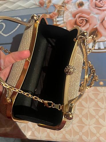 Zərif axşam çantası (klatç) - Rəng: şampan/qızılı tonlarında parlaq tekstura - Forma: qeyri-adi çoxbucaqlı dizayn, sərt korpus - Material: parıltılı toxumalı parça, qızılı tonlu metal çərçivə - Ba...