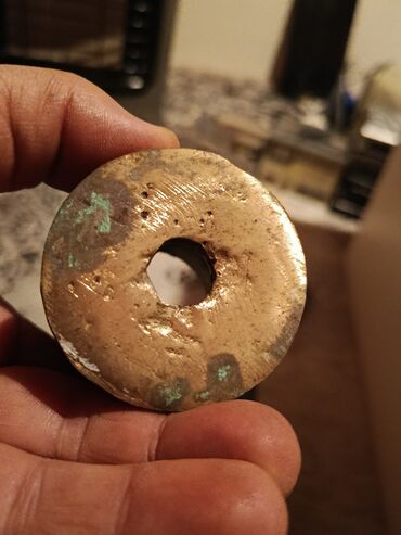 - Bürüncdən ağır disk/şaiba formalı hissə (şəkillərdədir). Mərkəzdə çoxbucaqlı deşik var; ehtimalən samovar/kran/val mexanizmi üçün çəkili balans və ya köhnə fitinq hissəsi kimi istifadə olunur.