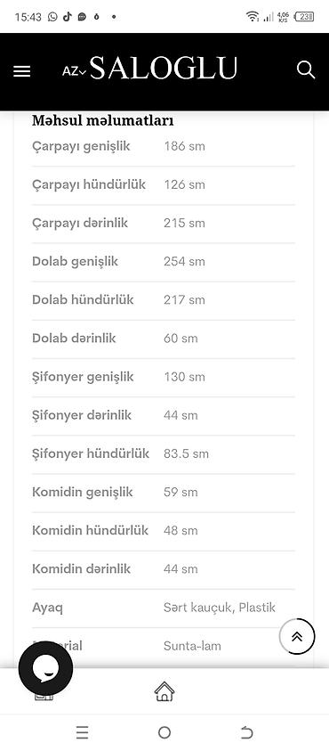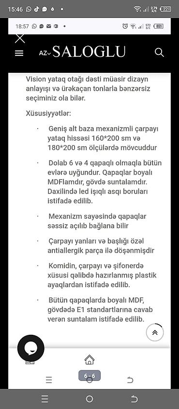 - Çarpayı: yumşaq başlıqla, dekorativ tikişlər; geniş alt baza mexanizmi üçün uyğun konstruksiya. Rahatlıq üçün bel yastığı daxil edilib.