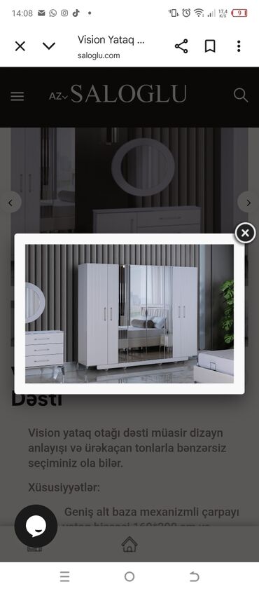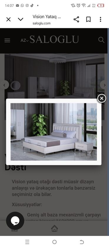 Müasir dizaynlı, açıq tonlarda şık yataq otağı komplekti. Zərif xətlər, güzgülü dolab fasadı və xrom ayaqlar həm estetik, həm də funksional görünüş yaradır. Dəst əsasən aşağıdakı mebellərdən ibarətdir: