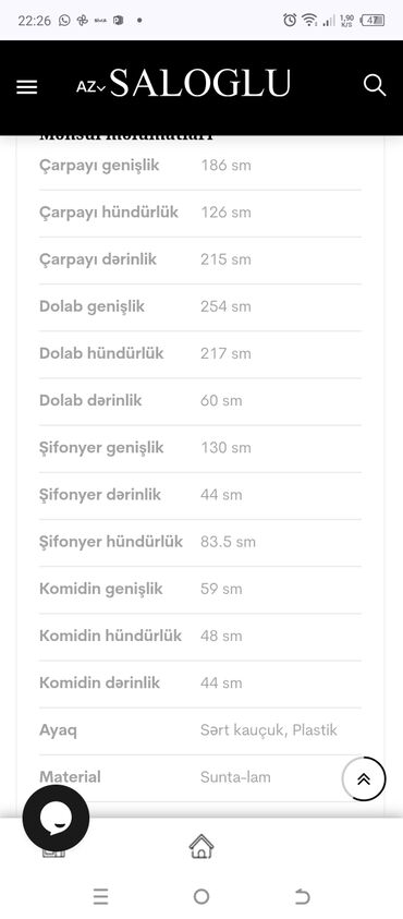 - Çarpayı: geniş alt baza mexanizmi ilə. Ölçülər – eni 186 sm, hündürlüyü 126 sm, dərinliyi 215 sm.