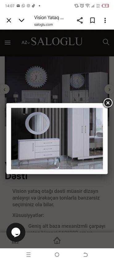 - Komod və güzgü: 3 çekmecə + 1 qapılı bölmə kombinasiyası; dairəvi divar güzgüsü ilə birlikdə. Zərif xrom tutacaqlar və hündür ayaqlar sayəsində təmizliyi asanlaşdırır.