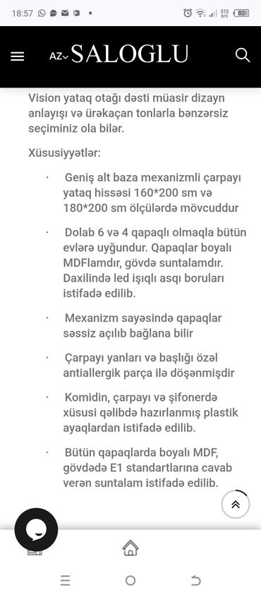 - Çarpayı: yumşaq başlıqla, düz xətlər və xrom ayaqlar. Neytral rəngli kumaş/deri üzləmə, yastıq/roller dəstəkləri ilə rahat görünüş.