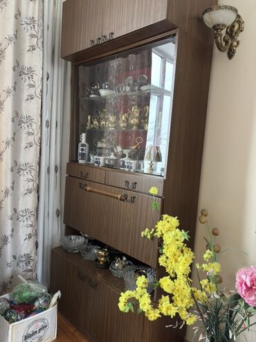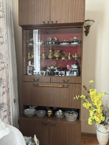 - Orta hissə: şüşə sürgülü vitrin (2 şüşə polka), iç hissə qırmızı fonla; vitrin altında 2 ədəd kiçik çekmece və geniş açılan qapı