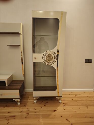 - 2 ədəd şüşə vitrin şkafı: ikiqat şüşə qapılar, içəridə 2 səviyyəli şüşə rəf, dekorativ qızılı naxışlar və tutacaqlar, yan panellərdə qəhvəyi ağac teksturası, aşağıda klassik oyma ayaqlar.