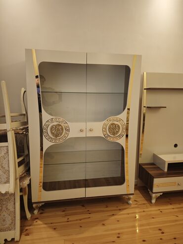 - 2 ədəd şüşəli vitrin şkafı: biri ikiqapılı, biri təkqapılı. Hər ikisində içəridə şüşə rəflər, dekorativ qızılı elementlər və klassik naxışlı tutacaqlar var. Şüşə önlüklər ekspozisiya üçün uyğundur.