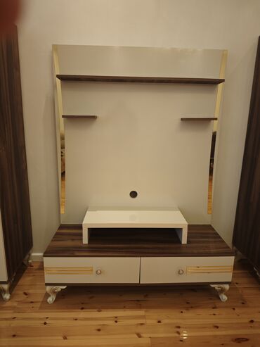 - TV stendi: orta ölçülü, böyük panel üçün arxa lövhə və təşkilat üçün çekmecələr.