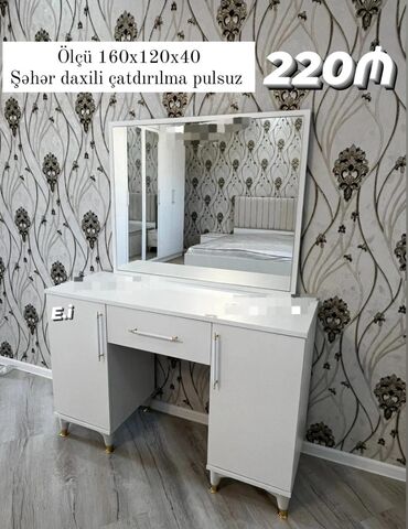 Vizaj masası və güzgü dəsti - Ölçü: 160 x 120 x 40 sm - Rəng variantları: ağ və boz/göy qurşağı qızılı aksentli model - Komplekt: böyük güzgü + masa - Quruluş: - 1 mərkəzi çekmece - 2 yan dol...