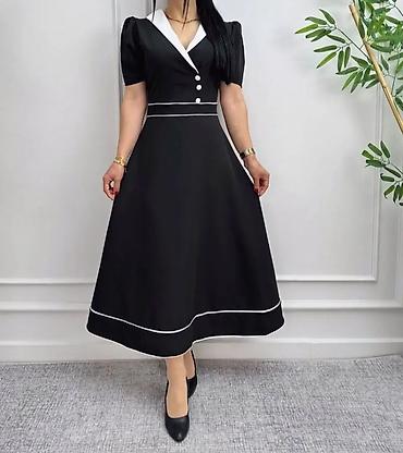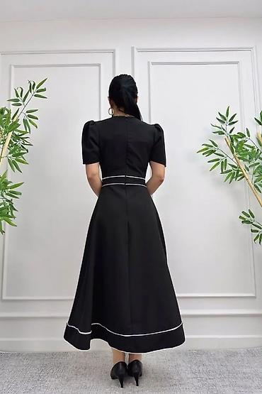 SARA Couture qadın donu - Rəng: qara - Ölçü: 48 (etiketdə göstərilib) - Model: dizdən aşağı uzunluqda, rahat düz kəsim - Yaxa: dairəvi - Qol: 3/4 uzunluqda, alt hissəsi plisse detallı - Bəzək: qol...