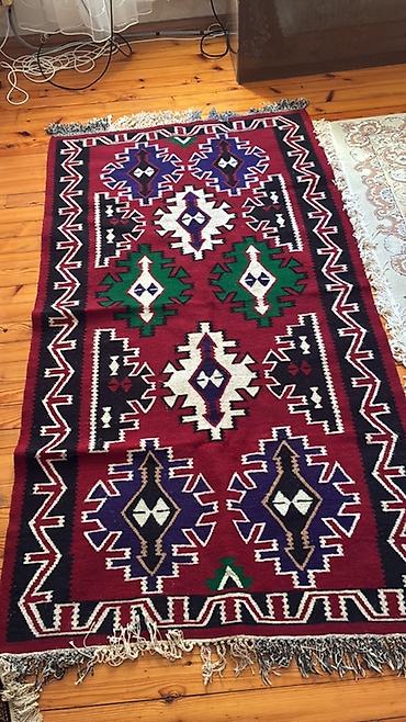 Xalça – əl toxuması kilim üslubu - Naxış: ənənəvi geometrik motivlər, mərkəzdə çoxrəngli simmetrik kompozisiya, geniş haşiyə - Rəng palitrası: tünd qırmızı fon, yaşıl, narıncı, çəhrayı, sarı, qara...