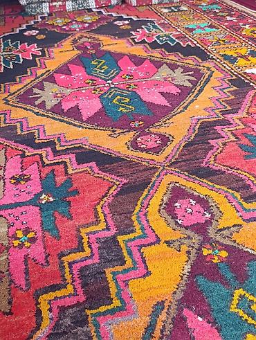 Rəngarəng əl toxuması xalça. Temiz yundur - Dizayn: Mərkəzdə uzunsov panellər və iç-içə həndəsi fiqurlar; kənarlarda çiçəkvari motivli haşiyələr - Rəng palitrası: Çəhrayı, magenta, narıncı, sarı, ...