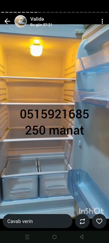 - Daxili yerləşim: 3 əsas rəf, aşağıda 2 tərəvəz yeşiyi, qapıda bir neçə plastik rəf